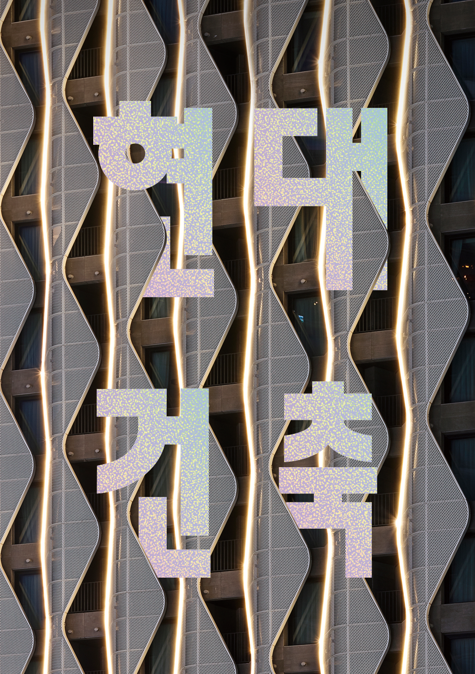 The Korean phrase 현대 건축 (hyundae geonchuk) used on the cover refers to contemporary architecture. The featured building is Mercure Ambassador Seoul Hongdae located in Mapo-gu District, Seoul. It was designed by Kim Chanjoong, head of THE_SYSTEM LAB. The photo was taken by Kim Yong-kwan.